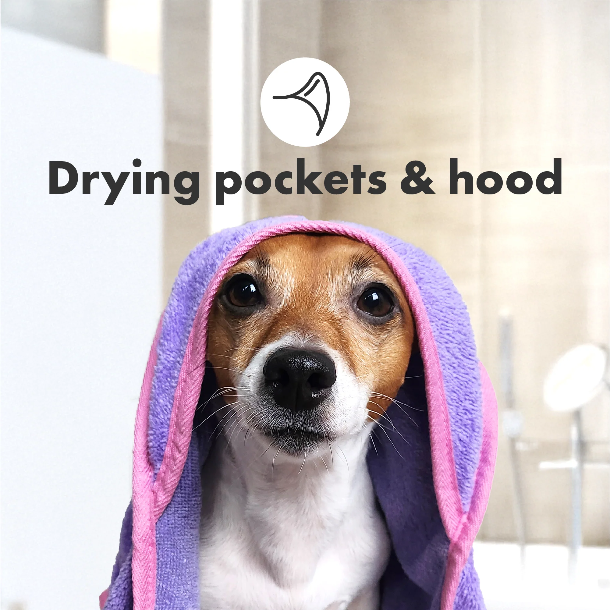 - Each towel comes with drying pockets and a hood for easy scrubbing and drying