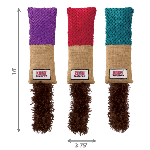 The KONG cat Kickeroo Cuddler comes with an enticing burlap for scratching instincts, a tri-texture for cuddle time and its shape is perfect to bat & roll for active fun.