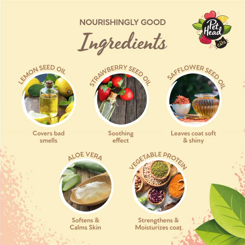 With natural oils & Extracts – Packed with strawberry and lemon seed oil, that have both nourishing as deodorizing properties, this product is very gentle and nourishing for every kitty! Safflower oil leaves the coat soft and shiny whilst vegetable protein and Aloe vera are helping with their soothing and healing properties.